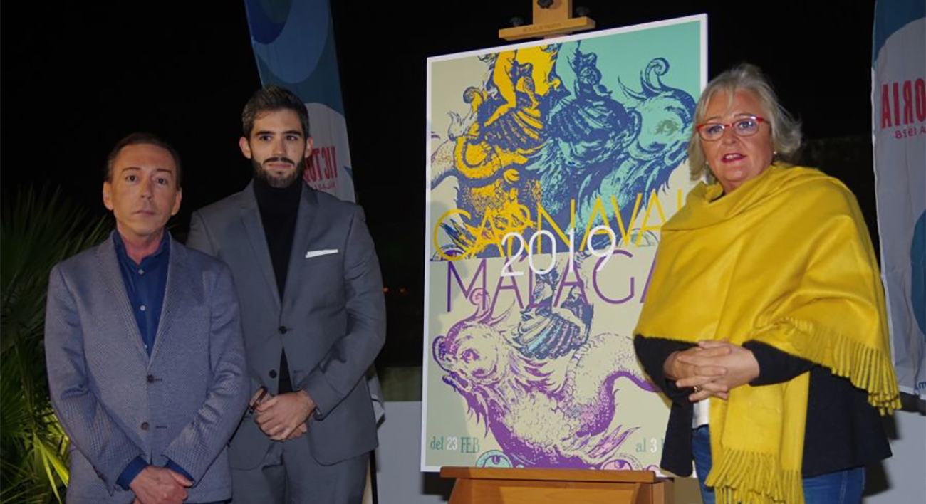 MÁLAGA, 16 DE NOVIEMBRE DE 2018.- La Fundación Ciudadana Carnaval de Málaga ha presentado el cartel oficial del Carnaval de Málaga 2019, que tendrá lugar entre el 23 de febrero y el 6 de marzo, y que ha sido realizado por el artista malagueño Pablo Flores. El boquerón, símbolo del final de la fiesta y del renacer de la misma cada año, centra la escena de la obra convertido en ser mitológico sobre el que cabalga el Dios Momo, que guía a los carnavaleros a lo largo de intensas jornadas de ilusión y diversión.