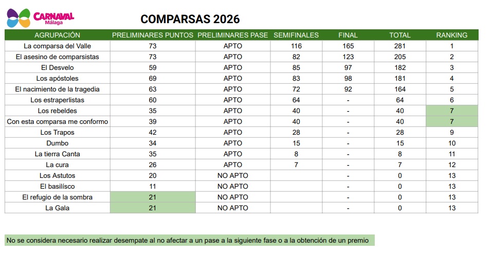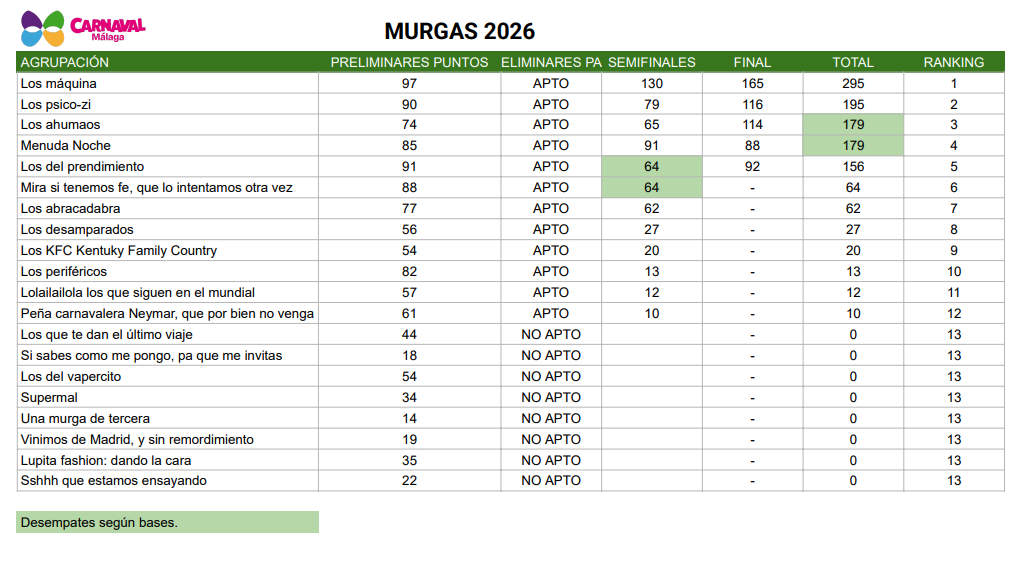 En cuanto al desempate obtenido entre las dos agrupaciones semifinalistas en la modalidad de murga se aplicó tal y lo que recogen las bases del COAC Málaga 2026 en su artículo 16.2., Es decir, «en el caso de que exista empate, será el jurado quien decida quién será el grupo que pase a esta fase, tras una deliberación individual de cada vocal.